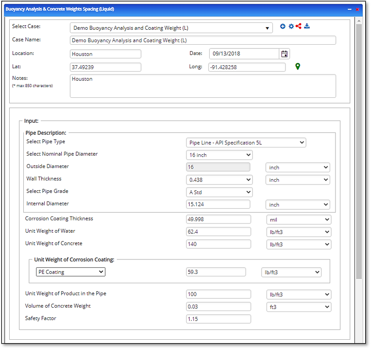 This calculation is used to determine downward forces and weights of a specified pipe resulting in the proper spacing of weights to counter the buoyance forces. The calculation does not account/allow for depth of water or burial.